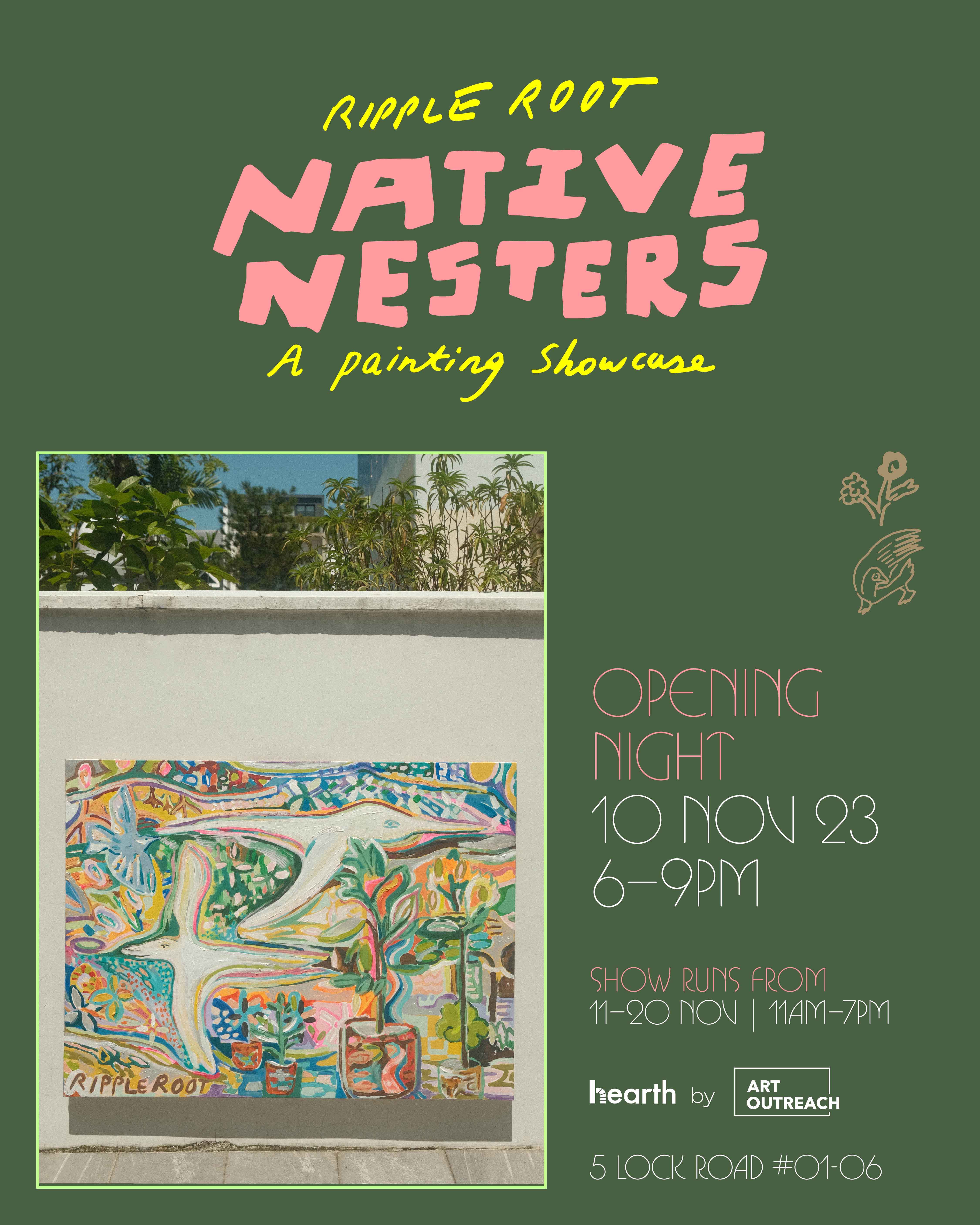NATIVE NESTERS is their tenth solo showcase, marking nine years of working together. Playing up the idea of nesting, the paintings feature native flora and fauna, with migrating birds integrating with local animals, folkloric symbols given a contemporary, whimsical twist. The paintings are joyful, dreamlike and nostalgic. A celebration of what makes a home. Accompanying the show is the launch of our 120-page retrospective book.
